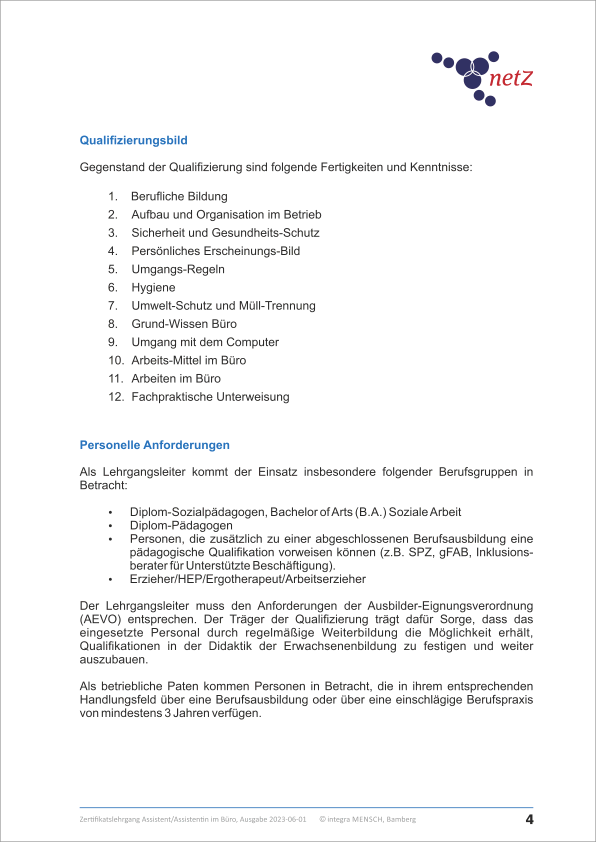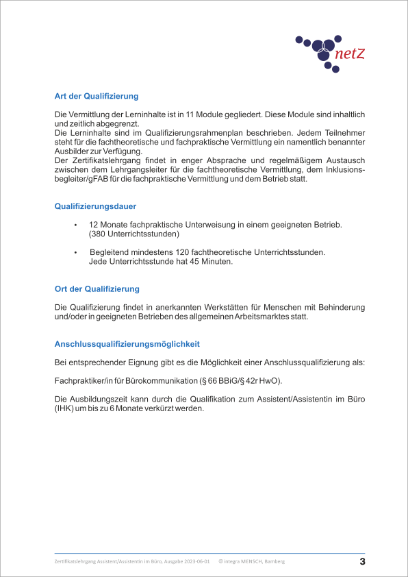 Der Lehrgang „Assistent/Assitentin im Büro“ eignet sich für Menschen mit Behinderung, die zum Beispiel in einem Büro in einer Behörde, einem Handwerks- oder Industriebetrieb oder im Einzel- und Großhandel arbeiten.